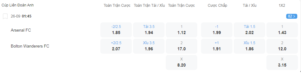 Tỷ lệ kèo Arsenal vs Bolton Wanderers