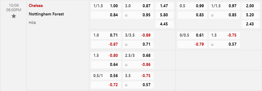Tỷ lệ kèo Chelsea vs Nottingham Forest