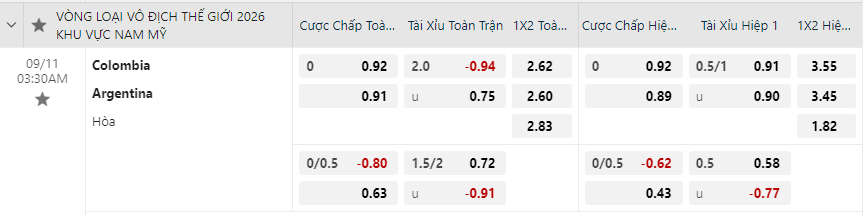 Tỷ lệ kèo Colombia vs Argentina