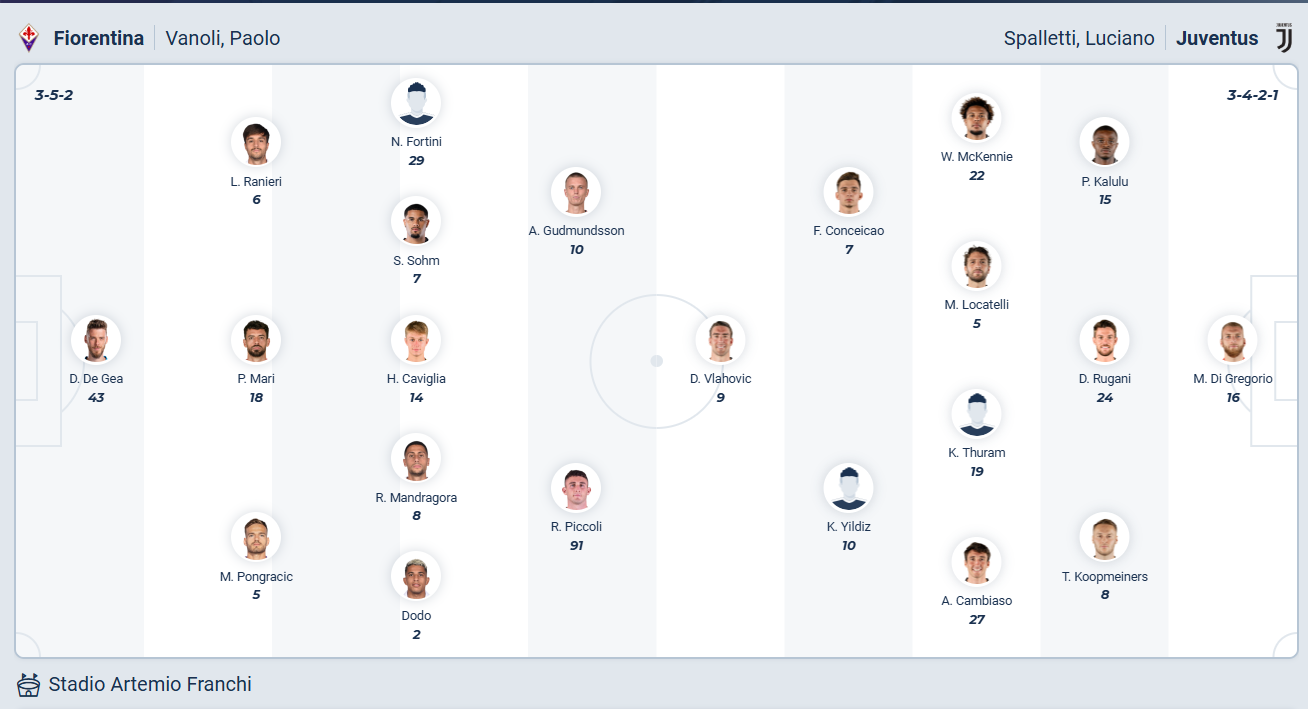 Fiorentina đang chơi vô cùng thất vọng mùa giải này, từ vị trí ở nửa trên bảng xếp hạng mùa trước họ đang đứng cuối bảng sau 11 vòng đấu và chưa giành được chiến thắng nào. Nếu không chơi cẩn thận hơn thì các cầu thủ Fiorentina hoàn toàn có thể phải xuống hạng vào cuối mùa và đó thực sự là thảm họa với họ. Chính vì vậy đội bóng đang được dẫn dắt bởi HLV Paolo Vanoli cần một chiến thắng ở vòng đấu thứ 12 này. Tuy nhiên trước đối thủ mạnh hơn như Juventus thì có lẽ một kết quả hòa cũng là đủ cho Fiorentina.
