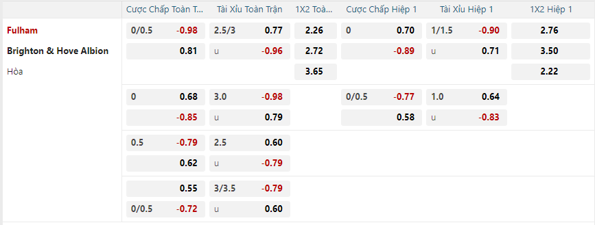 Soi kèo hiệp 1 Fulham vs Brighton: 0.77*0.25*0.58