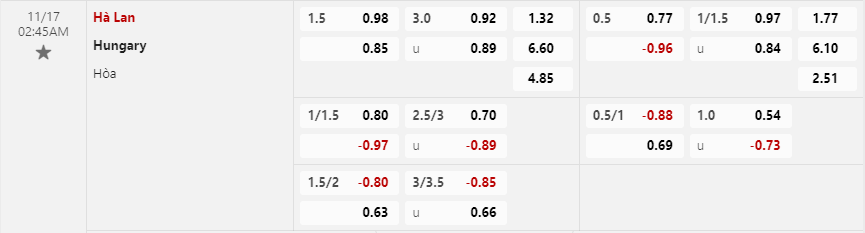 Tỷ lệ kèo Hà Lan vs Hungary
