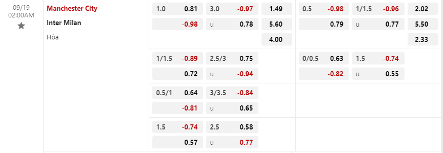 Soi kèo châu Á Manchester City vs Inter Milan
