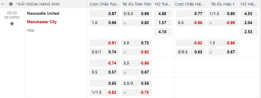 Soi kèo châu Á Newcastle United vs Manchester City
