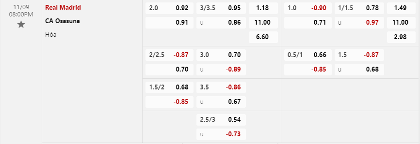 Soi kèo châu Á Real Madrid vs Osasuna: 0.87*2.25*0.70