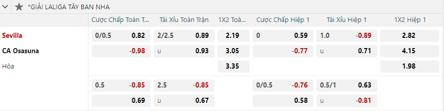 Soi kèo châu Á Sevilla vs Osasuna: 0.85*0.5*0.69