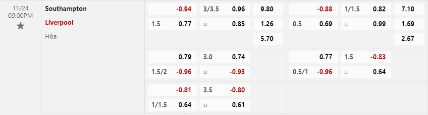 Soi kèo hiệp 1 Southampton vs Liverpool: 0.69*-0.25*0.88