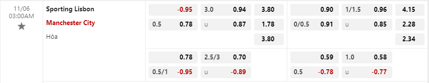 Tỷ lệ kèo Sporting Lisbon vs Manchester City