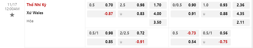Soi kèo châu Á Thổ Nhĩ Kỳ vs Wales: 0.87*0.5*0.70